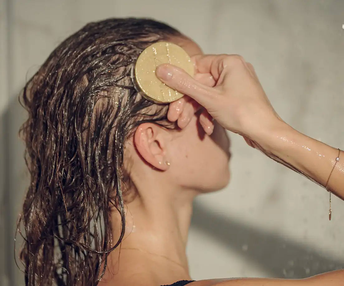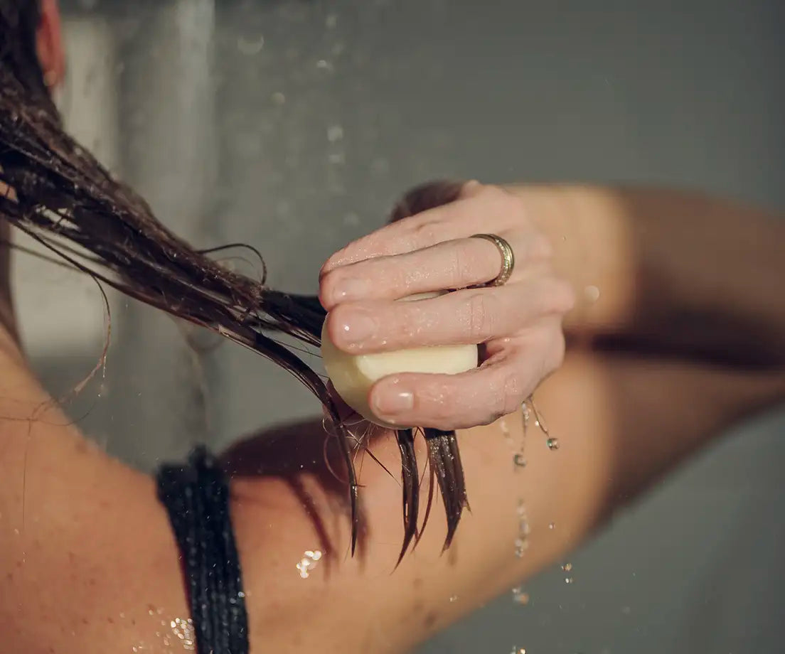 Sudrėkinkite šampūno gabalėlį ir trinkite tarp delnų arba tiesiai į drėgnus plaukus.