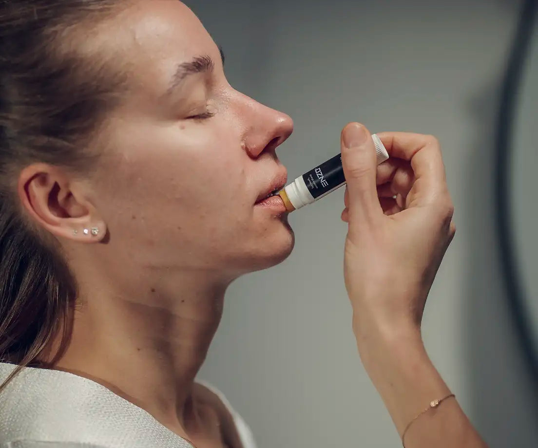 1. Tepkite ant švarių lūpų – švelniai paskirstykite balzamą pirštu arba tiesiai iš tūbelės.